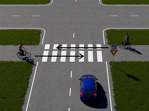 Cyklister bör väja. Observera trafikmärkets läge. Om cyklisten leder cykeln ses han som fotgängare och man bör väja.